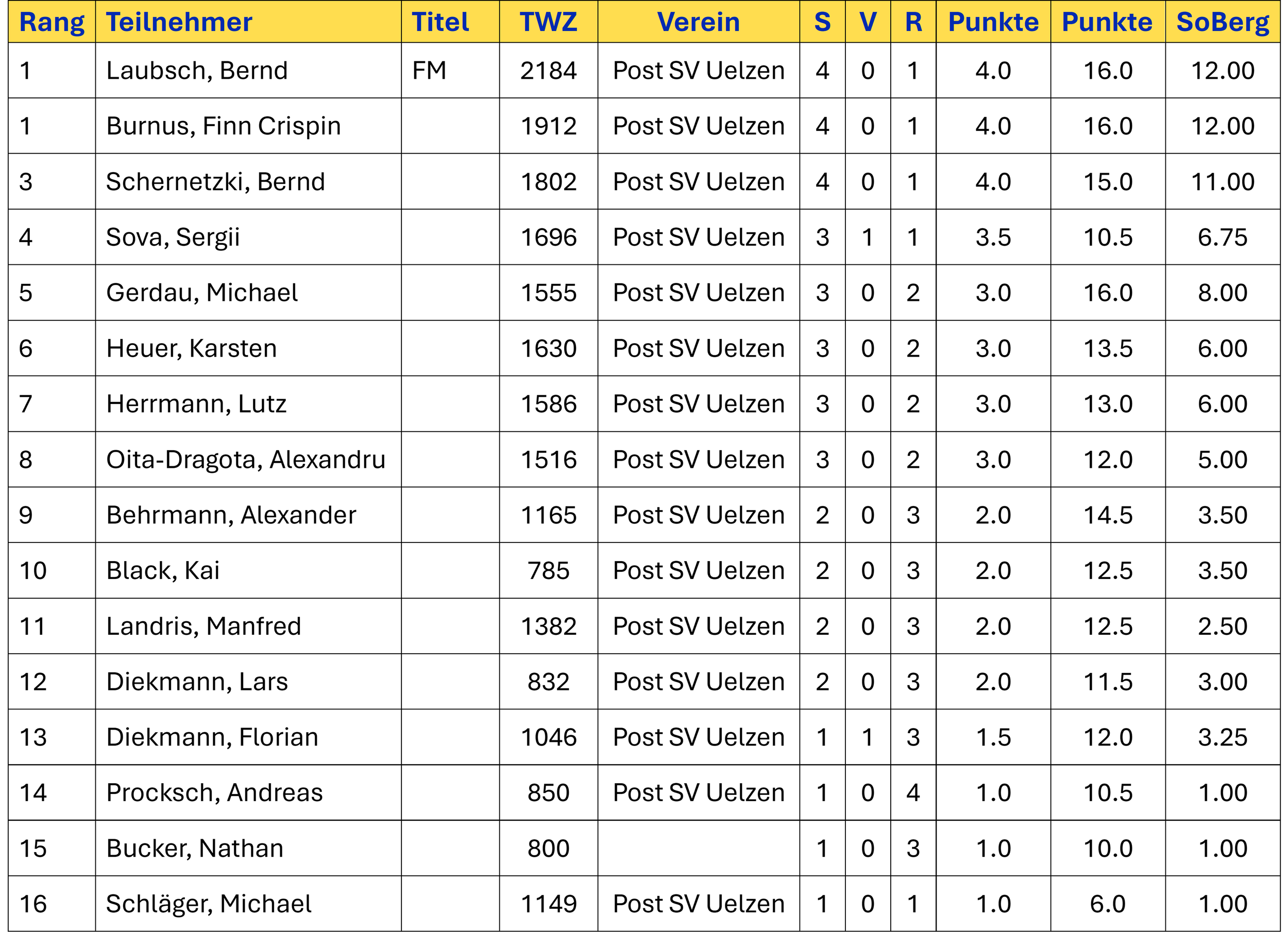 Dann gab es vier Mannschaften mit jeweils 7:3 Punkten und die Zweitwertung musste entscheiden. Platz 2 ging wie im Vorjahr an den ungeschlagenen Post SV Uelzen, der die deutlich bessere Wertung vor dem SK Lehrte aufwies, der den dritten Platz ebenfalls verteidigte. Damit haben sich diese 3 Mannschaften für die deutschen Pokalmannschaftsmeisterschaften qualifiziert.