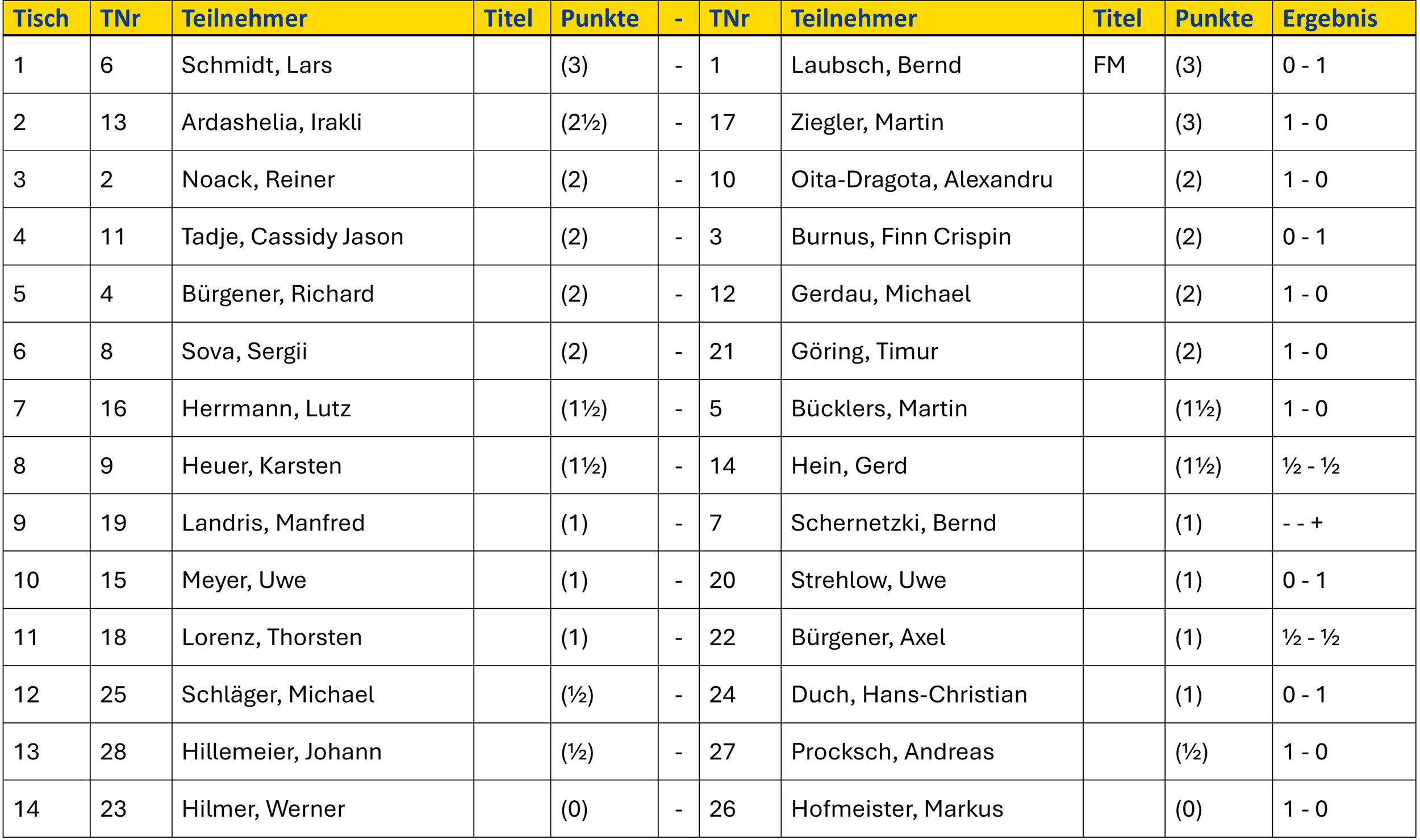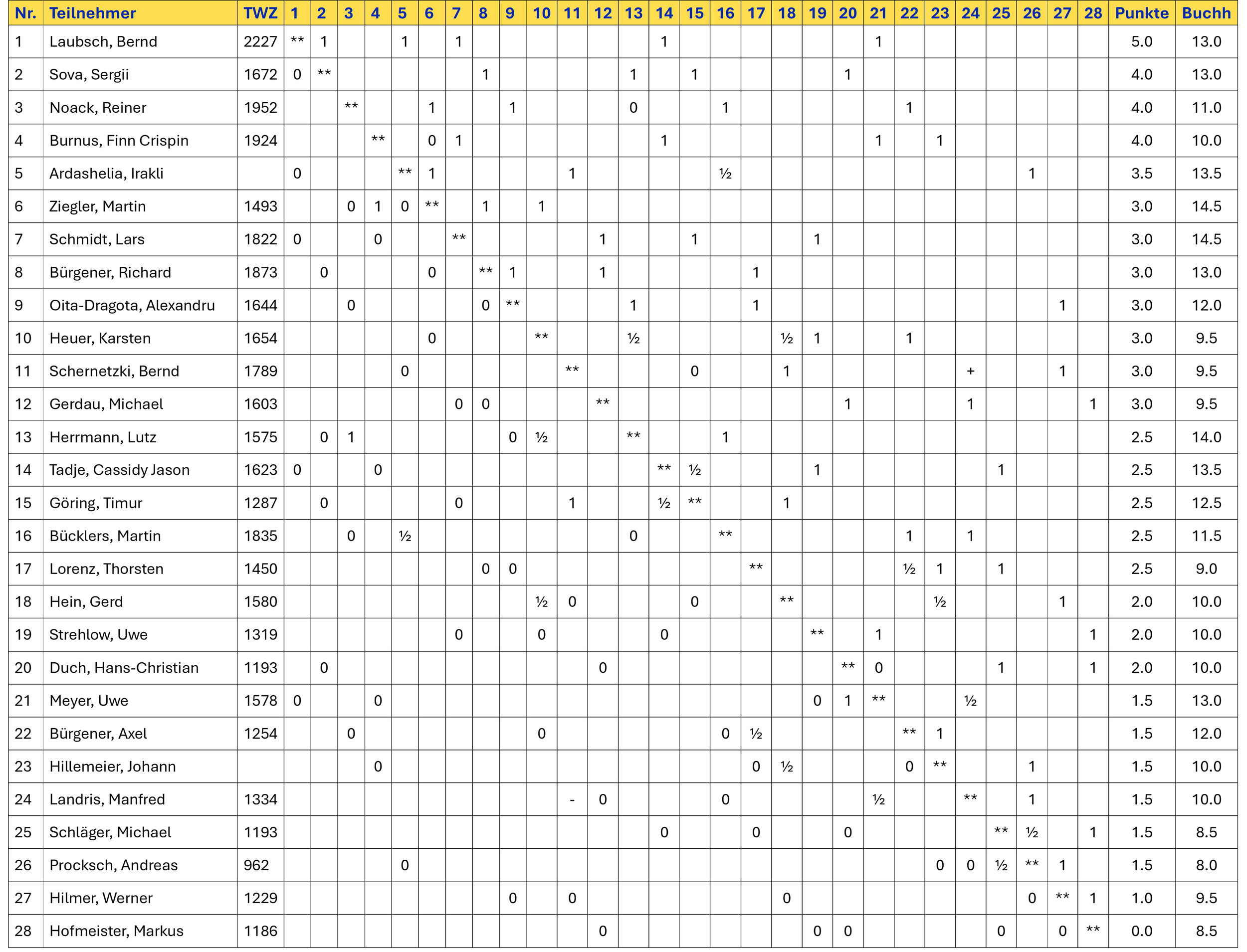 Es führt Bernd Laubsch (4:0 Punkte) vor Martin Bücklers (3,5). Auf den Plätzen folgen Philipp Falke, Bernd Schernetzki, Sergii Sova, Gerd Hein, Lutz Herrmann und Richard Bürgener (jeweils 3:1).